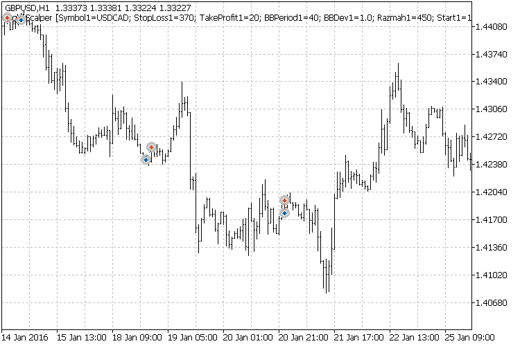 For a sell order, the price must be above the upper Bollinger Bands boundary, and again, the channel must be narrower than the specified Razmah range.