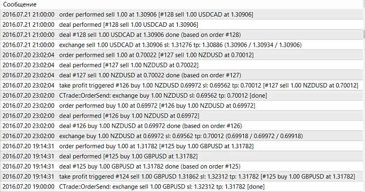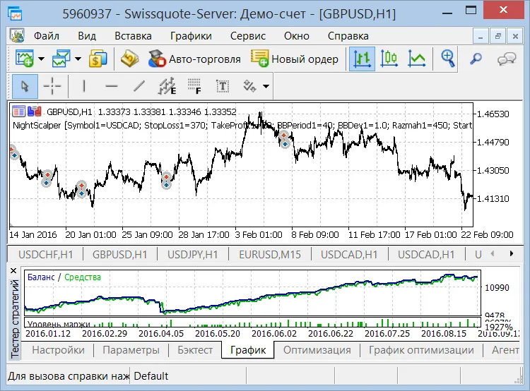 Fig.3. Results of the EA trading and optimization from 11.01.2016 to 13.09.2016. USDCAD, GBPUSD, NZDUSD, H1