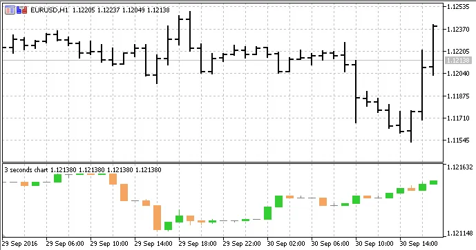 这个指标与传统的基于K线或点差的指标不同,它是完全基于时间来生成数据的。每隔设定的秒数,它就会生成一根新的烛台,显示开盘价、收盘价、最高价和最低价。