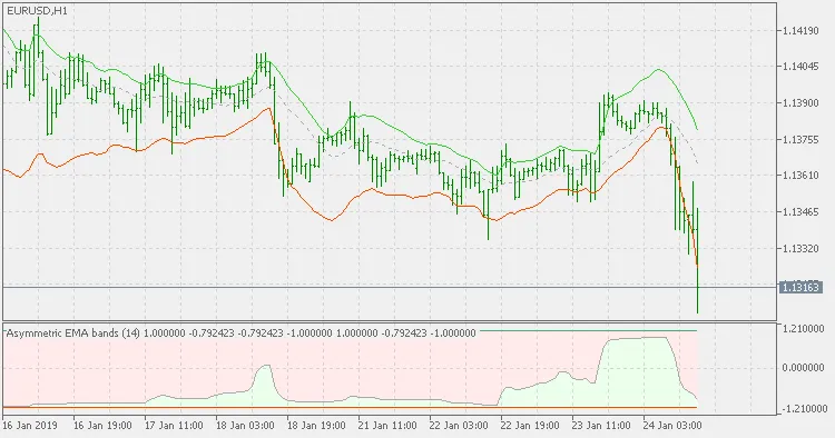 Deze indicator maakt gebruik van een asymmetrische methode voor het berekenen van de bands. In plaats van dezelfde afstand voor de boven- en onderbanden te gebruiken, worden ze apart berekend en vervolgens omgezet in een oscillator. Je kunt kiezen uit een van de vier mogelijke gemiddelden: