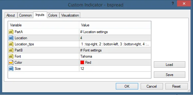 De BSpread indicator is een handige tool die je helpt om de spread op je grafiek weer te geven. Met deze indicator kun je eenvoudig de lettertype, kleur en grootte instellen, en bovendien de positie op de grafiek kiezen aan de hand van de volgende waarden in de indicatorinstellingen: