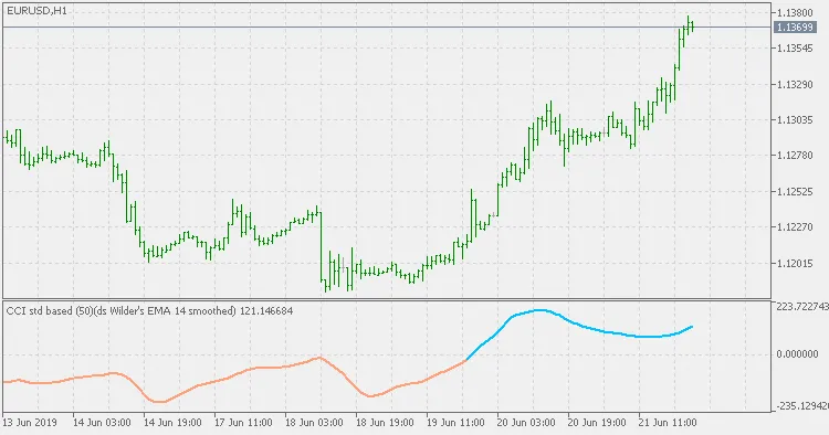 Indikator CCI (Commodity Channel Index) asalnya dikira menggunakan kaedah mean absolute deviation. Namun, versi ini menggunakan standard deviation sebagai gantinya. Untuk menjadikannya kurang "gugup" (salah satu sebab utama mengapa CCI tidak begitu popular), kita menggunakan penyaringan awal dengan menggunakan double smoothed Wilders EMA, dan isyarat dihasilkan ketika melintasi angka sifar.