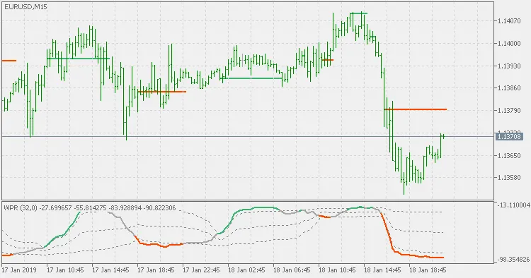 Además, esta versión muestra una especie de niveles de soporte y resistencia en el gráfico principal cuando la señal del WPR cambia.