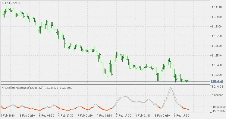 L'indicateur original (avec plus d'explications) a été publié ici : M-Oscillateur. Dans sa description initiale, NGBaltic indique que l'M-Oscillateur oscille entre les valeurs +14 et -14, ce qui, malheureusement, n'est pas tout à fait exact. Cela est correct uniquement pour la période principale de 14. Pour toutes les autres périodes, les plages de valeurs sont différentes. Dans cette version, et afin de conserver l'esprit original de l'indicateur tel que décrit par NGBaltic, cet indicateur oscille effectivement dans les plages de +14 à -14 (j'ai décidé d'utiliser cette plage étrange simplement parce que NGBaltic l'a mentionnée) et des niveaux significatifs (fixes) pour les signaux peuvent également être utilisés. En ce sens, dans la version étendue, nous avons non pas 3 types de changements de couleur mais 4 :