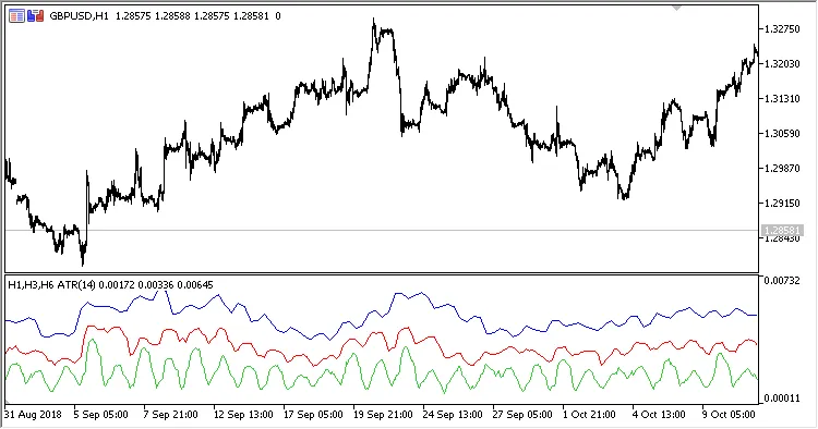Fig.2. Three Bigger Time Frame ATR. H1, H3, and H6 ATRs displayed on the H1 chart, Drawing mode = Slope