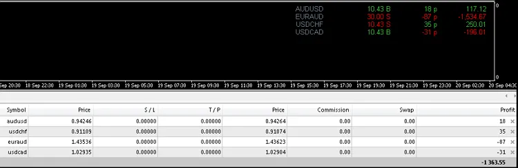 아래 케이스를 MT4 터미널 값과 비교하기 위해 진행한 거래를 보여주는 이미지입니다: