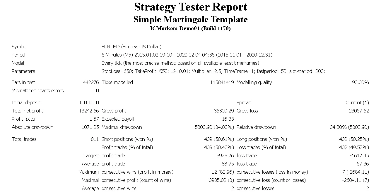 โปรแกรมง่ายๆ แต่มีฟังก์ชันที่ครบถ้วน ซึ่งแสดงให้เห็นว่ามาร์ติงเกลสามารถทำงานให้คุณได้อย่างไร เพียงแค่เปลี่ยนการวิเคราะห์การเข้าเทรดด้วยกลยุทธ์การสแกลปิ้งของคุณเอง และสไตล์การจัดการเงินส่วนตัวของคุณ จากนั้นทำการปรับแต่ง หากเป้าหมายของคุณคือการทำกำไรอย่างสม่ำเสมอ ไม่ใช่การทำกำไรในอัตราสูง และคุณมีทุนที่พร้อมจะใช้ เทมเพลตนี้อาจเหมาะสำหรับคุณ ก่อนอื่นให้ปรับแต่งด้วยทุนที่มีการลดสูงสุดไม่เกิน 50% หากต้องการความระมัดระวัง ควรจะต่ำกว่า 30% จะดีที่สุด