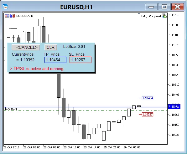 エントリーはマウスのクリックで行います。もし有効化され、「実行」に設定されている場合は、BUYまたはSELLのいずれかのオープンポジションを自動的に検出します。その後、現在の価格がマークされたテイクプロフィットまたはストップロスの価格に達すると、オープンポジションに対抗するために即時の買いまたは売りを実行します。また、無効な手続きについて警告するアラートメッセージも使用され、誤った価格範囲でリミットを設定した場合などに通知されます。パネルのシャドウ効果は、実行中にティックの変化に合わせてグレーからブラックに変わります。