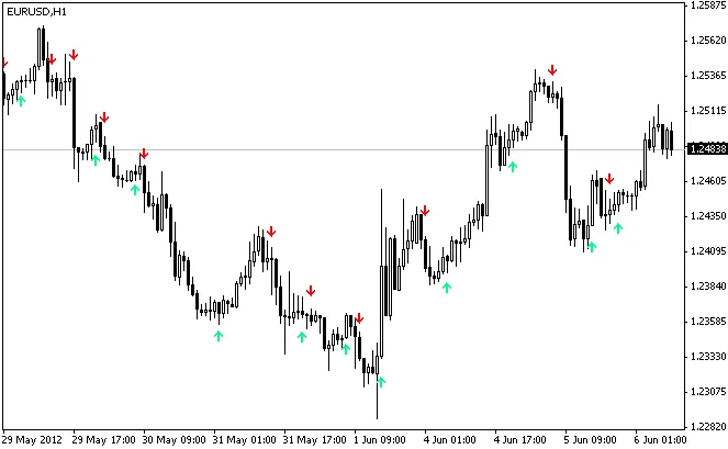 第一个指标是LWMA交叉信号。它在图表上绘制了两个点,表明快速和慢速LW移动平均线的交叉。向下的红色箭头表示下跌趋势,而向上的春绿色箭头则表示上涨趋势。这些都是我用于判断短期或长期交易的信号。