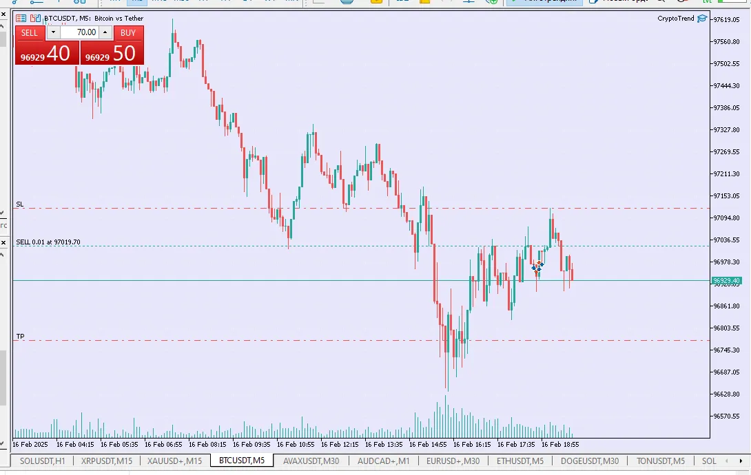 Tahap Stop Loss (SL) dan Take Profit (TP) dikira berdasarkan perbezaan antara harga masuk dan tahap sokongan/rintangan dengan nisbah risiko:untung yang agresif. -