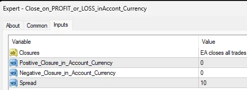 Positive_Closure_in_Account_Currency는 현재 Equity 금액보다 높아야 하며, 그렇지 않을 경우 거래가 즉시 실행됩니다.