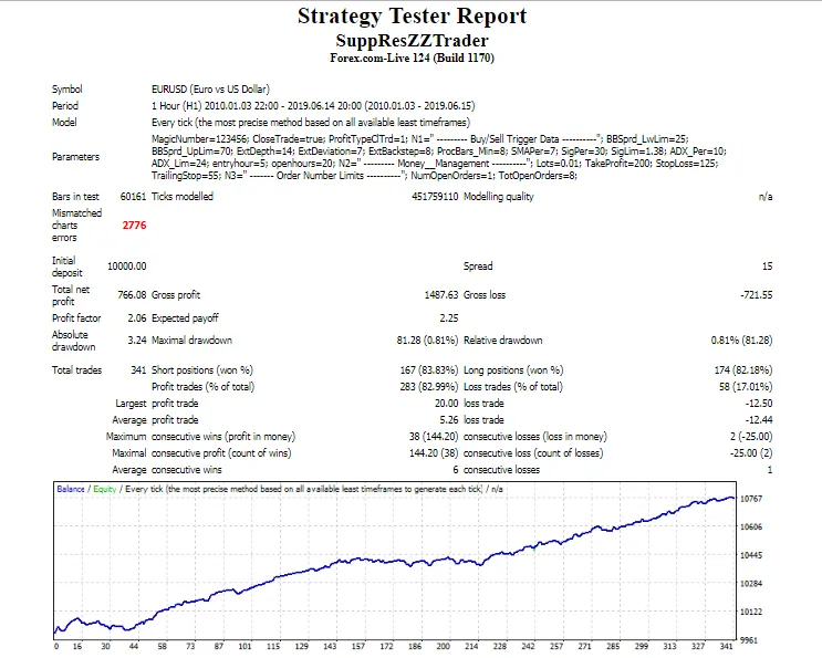 또한, ADX와 볼린저 밴드 지표 값은 추가적인 거래 진입 필터로 사용됩니다. 열린 거래는 거래 신호 반전 시 종료될 수 있습니다. 지그재그 지표는 가장 최근의 지그재그 구간 길이를 결정하는 데 사용됩니다. 이 정보는 구간 시작 시 지지와 저항 값을 계산하는 데 도움을 줍니다. 이 EA는 H1 EURUSD 차트를 사용하며, 2010년 1월부터 2019년 6월까지 테스트되었습니다.
