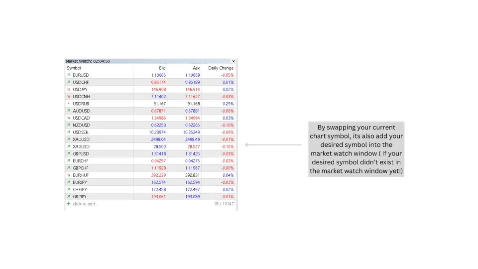 - 차트에서 심볼을 교환할 때마다 새로운 심볼이 자동으로 마켓 워치에 추가되어 실시간 데이터와 시장 정보를 즉시 이용할 수 있습니다.