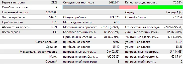 Below, you'll find the results from testing the EA on the EURUSD pair during 2015 on the H4 chart, using the default settings: