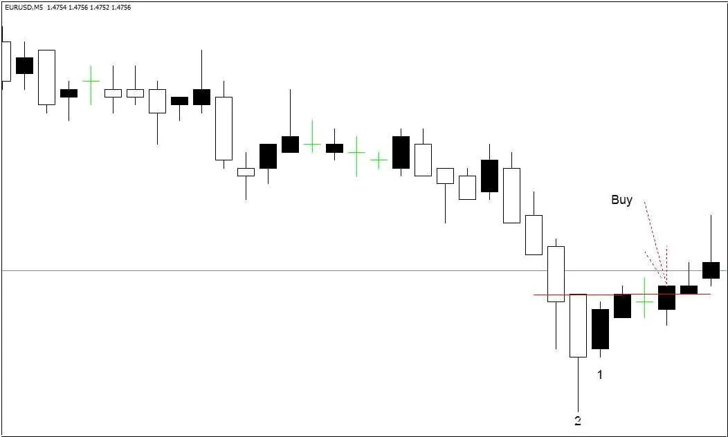 ถ้ามีสัญญาณซื้อ - ราคาปิดของแท่งที่ข้ามระดับเข้าเก่าควรสูงกว่าระดับเข้าเก่า ซื้อทันทีหลังราคาปิดนี้ แท่งนี้ไม่จำเป็นต้องเป็นแท่งถัดไปเสมอไป ตามที่แสดงในภาพ การยืนยันหลักคือราคาปิดสูงกว่าระดับเข้าเก่า.