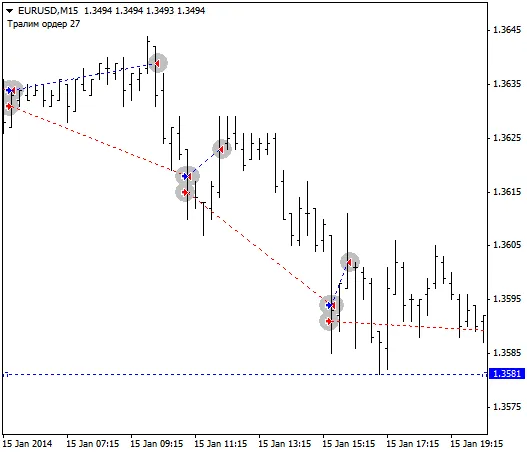 オーダーの利益が7ポイントに達すると、バーチャルストップロスはオーダーの開設価格に最小利益の2ポイントを加えた位置に移動します。その後、価格が利益方向に3ポイント進むと、ストップロスは利益の5ポイントの位置に移動し、これを繰り返して価格を5ポイントの距離で追いかけます。もし価格がストップレベルに戻った場合、オーダーはクローズされます。